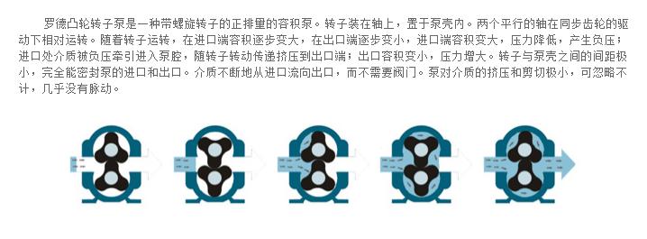 工作原理如下:當(dāng)動(dòng)力帶動(dòng)傳動(dòng)軸傳遞扭矩時(shí),主動(dòng)軸驅(qū)動(dòng)齒輪箱內(nèi)的一對同步齒輪及固定在泵軸上的二個(gè)轉(zhuǎn)子做相對運(yùn)動(dòng),使泵吸入端產(chǎn)生真空,排出端形成負(fù)載壓力,來達(dá)到輸送液體介質(zhì)的目的。動(dòng)力機(jī)的轉(zhuǎn)向決定了泵輸送介質(zhì)的方向,無正反轉(zhuǎn)之分,在規(guī)定的轉(zhuǎn)速范圍內(nèi)泵的流量大小與泵的轉(zhuǎn)速成正比。